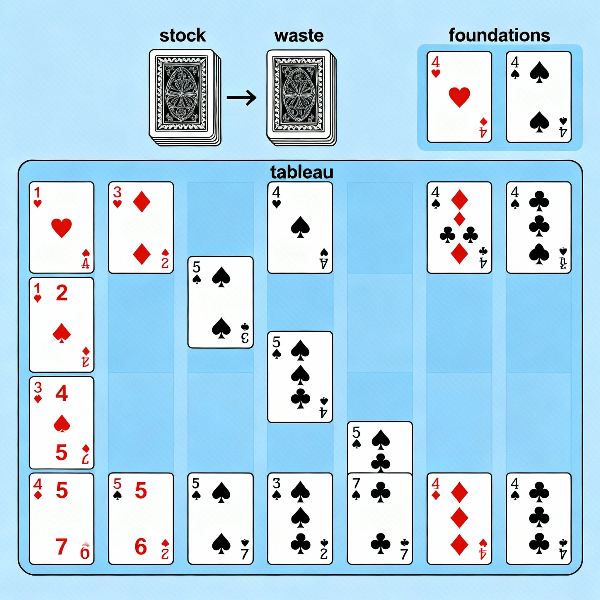 Seitsemään tableau-pinoon kuvapuoli alaspäin 1–7 korttia ja loput stock-pakkaan[ ].