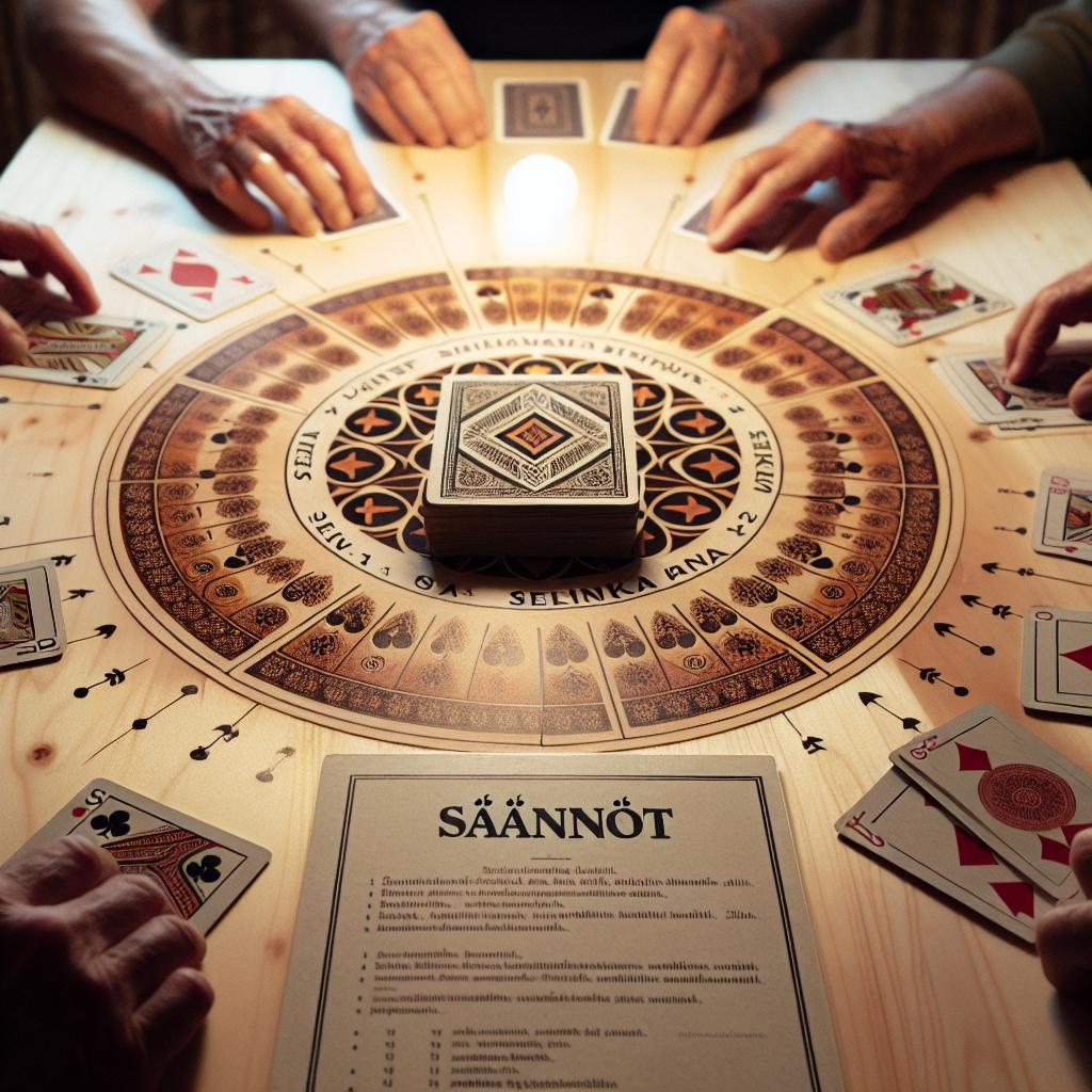Players engaged in the Finnish card game Seiska with a dedicated rule sheet on the table