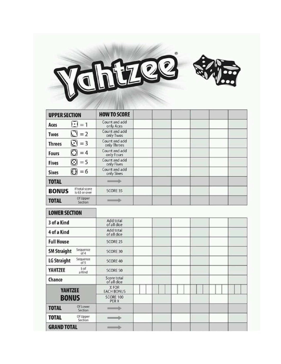 - Bonus yläkerrassa: Kun yläkerran summa ≥ 63 pistettä, lisätään 50 bonuspistettä [“Paljonko Yatzyssa pitää saada pisteitä, että saa bonuksen?”]